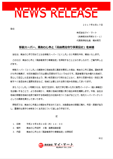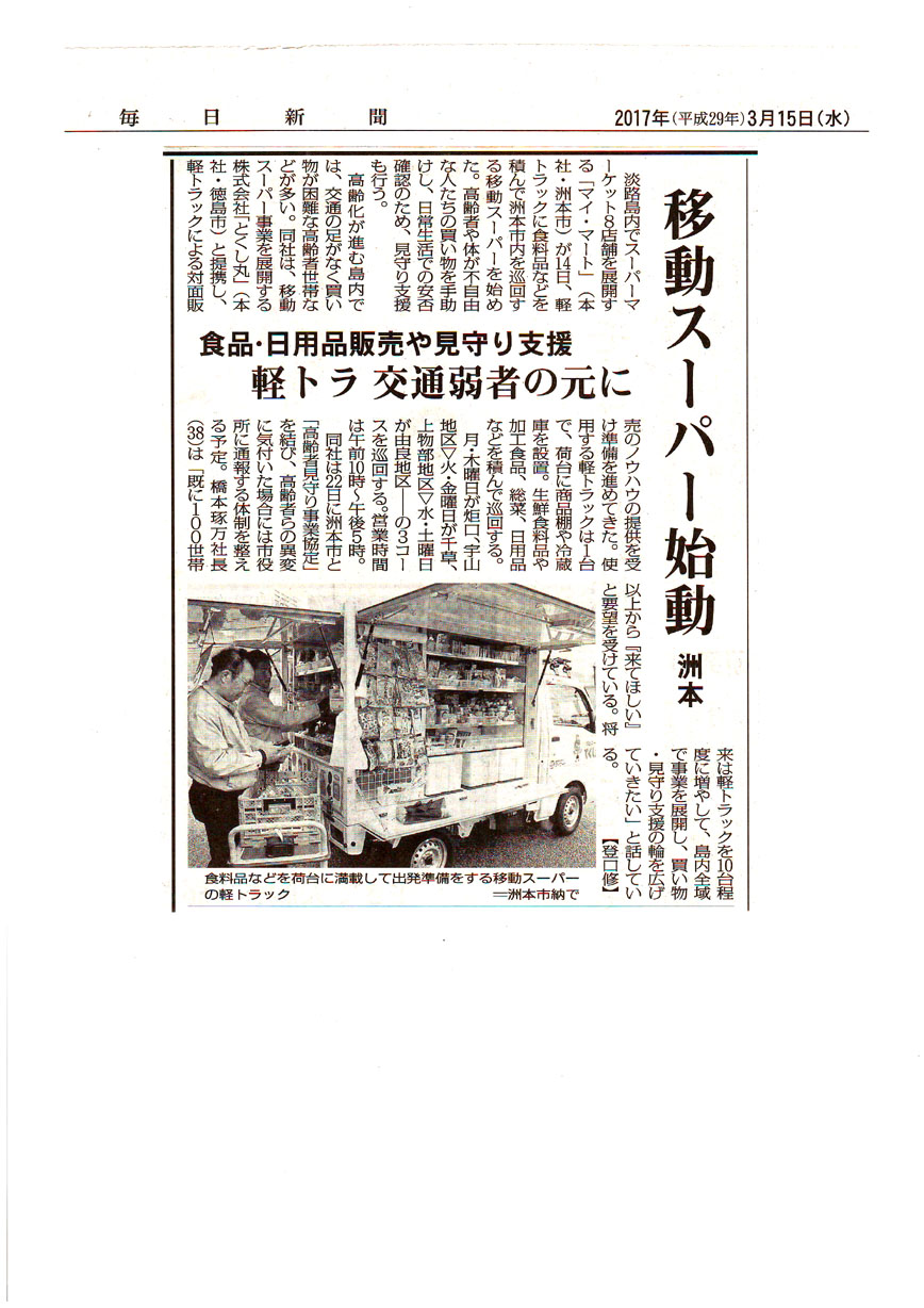 _____________________ [ニュースリリース] 2017年10月09日  ̄ ̄ ̄ ̄ ̄ ̄ ̄ ̄ ̄ ̄ ̄ ̄ ̄ ̄ ̄ ̄ ̄ ̄ ̄ ̄ ̄ 【南あわじ市で初 移動スーパー「とくし丸」2号車開業のお知らせ】 当社は、南あわじ市で営業するマイマート三原店を拠点に10月19日(木)より、日常のお買い物にご不便されているご高齢者、お身体のご不自由な方が住み慣れた地域で、安心して自立した生活を営む一助となるべく、移動スーパー「とくし丸」2号車を開業します。